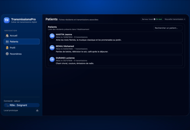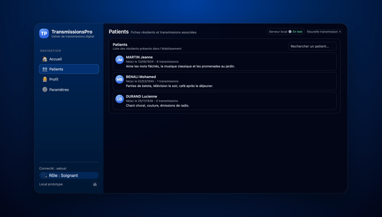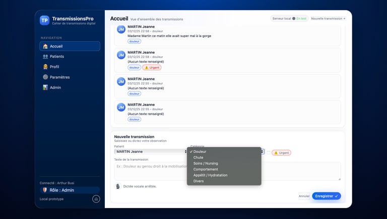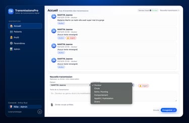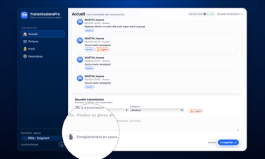 Vous pouvez rédiger une transmission médicale en cliquant sur "nouvelle transmission" en sélectionnant le patient, puis la catégorie, et enfin taper le texte ou bien utiliser la fonctionnalité vocal : appuyez sur l'icône micro, parlez, cliquer sur le bouton stop, puis enregistrez. Simple et efficace.