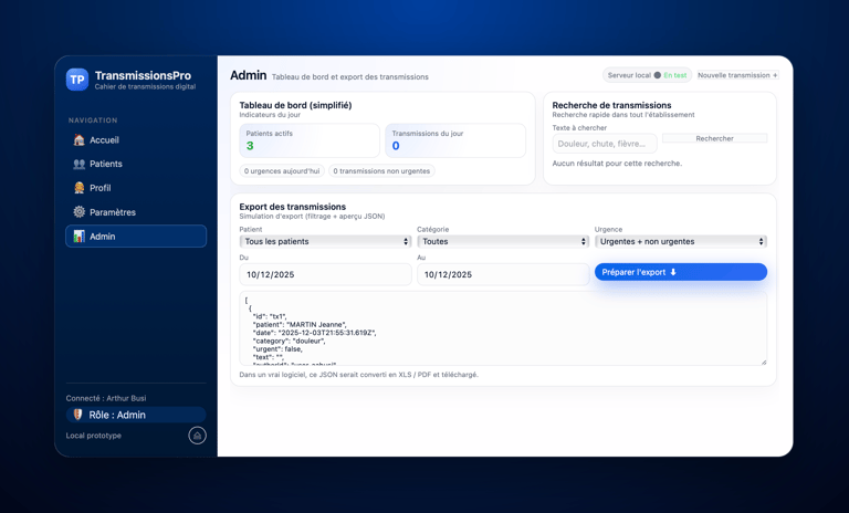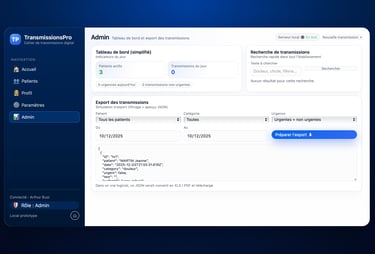 Une fonctionnalité permet à l'administrateur, IDEC et MedCo d'exporter les données. Ils peuvent sélectionner toutes les transmissions du patient, ou encore la catégorie de transmission, mais aussi l'intervalle de temps. Facilitant le travail pour les audits.