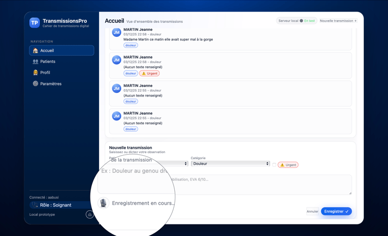 Nous avons ajouté une fonctionnalité qui révolutionne les transmissions médicales : la Retranscription vocale. Elle détecte le jargon médicale et simplifie les transmissions.
